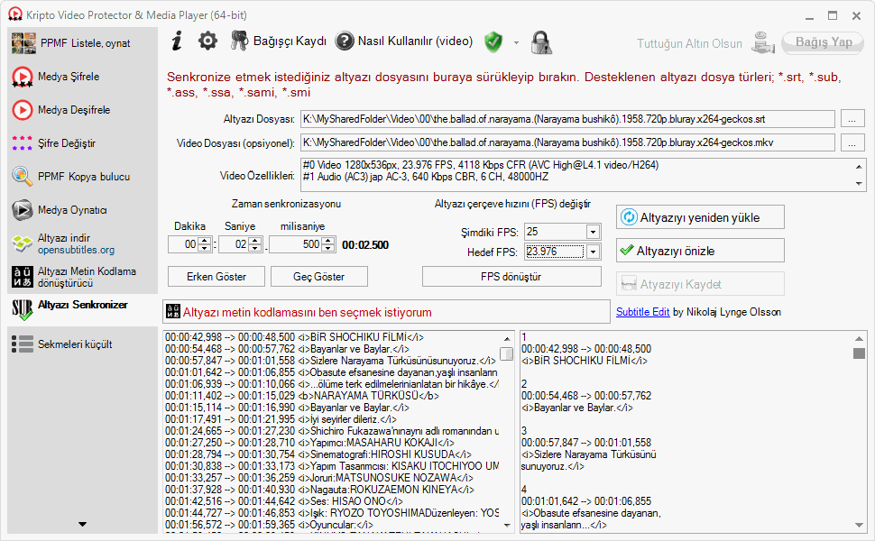 programının özelliklerinden birisi de senkronizasyon problemi olan altyazıların zaman ve çerçeve hızı (FPS) senkronizasyonlarını yapmanıza olanak tanımasıdır.