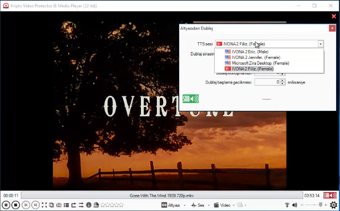 Kripto video protector & Media Player programının özelliklerinden birisi de Türkçe altyazılı filmleri TTS (text-to-speech) kullanarak bilgisayara seslendirip Videoları Türkçe dublaj olarak izleme olanağı sunmak. Bu özellik altyazı okumaktan hoşlanmayanlar, görme engelliler, yavaş okuma problemi olanlar, yaşlılar ve okumayı yeni öğrenmiş çocuklar için çok faydalı bir özelliktir. TTS teknolojisi şu anda oldukça gelişmiş durumda. Sesler insan senine son derece yakın ve kolay anlaşılabiliyor. Aşağıdaki Türkçe dublaj film izleme örnek videosune bakmalısınız.
